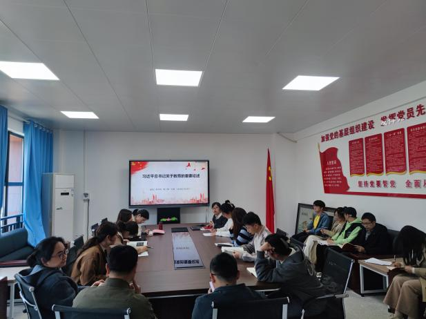 活动第一阶段,全体党员在王平的带领下集中学习《深入学习习近平总书记关于教育的重要论述》,文章中重点阐述了习近平总书记紧密围绕“培养什么人、怎样培养人、为谁培养人”这一教育的根本问题,如何深化“教育、科技、人才”三位一体发展思路。学习结束后,刘柏建同志发言:作为青年党员教师,要时刻保持着“有理想、敢担当、能吃苦、肯奋斗”的精神状态,青年力量涵养国家力量,广大青年要充分发挥自己的力量,助推强国建设、民族复兴。