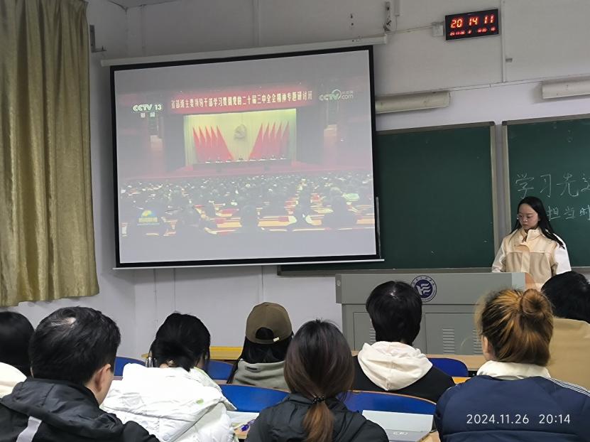 为认真学习贯彻党的二十届三中全会精神,深刻领悟习近平总书记重要讲话精神的实质和内涵,推进党纪学习教育,公司员工第三党支部于11月26日晚在红楼107室主题党日活动,活动由支部书记朱笑雨主持,支部全体党员参加。