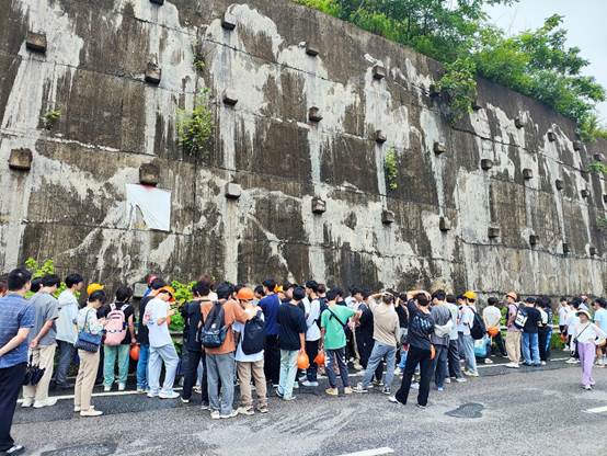 实习第三站,师生们前往株洲铜霞路梅子坡的两处边坡加固点,参观锚杆挡土墙与桩板式挡土墙,通过实地观察和专业老师的讲解,同学们对挡土墙的结构与加固原理有了初步的认识,加深了岩土支挡结构与对边坡防治的认识。