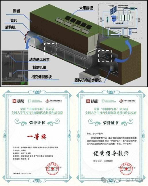 “基于相变储能与太阳能溶液除湿的定向追踪空调器该作品创新性提出了地铁盾构隧道空调系统,通过相变储能的削峰填谷极大减少了系统装机容量,同时利用太阳能与溶液除湿耦合的新风处理装置降低隧道内部湿度。送风末端的定向追踪系统在保障人员热舒适的前提下极大降低冷负荷需求。为推动我国隧道通风制冷的节能减排发展做出了积极的贡献。