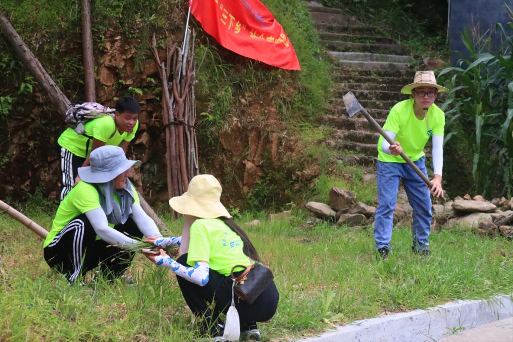 道路除草行动是实践团助力改善埔坪村人居环境、实施乡村振兴战略的重点实践活动之一,成员们在铺坪村驻村干部的指引下,顶着烈日、携带工具,沿着村内主干道两旁进行杂草清理。手持镰刀和锄头工具的实践团成员忙碌穿梭的身影成为了道路两旁靓丽的风景线,他们用汗水助力美丽乡村建设,获得了村民的高度肯定,路过的村民纷纷向团队队员们竖起了大拇指。