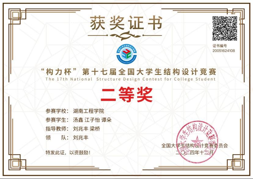 2024 年 11 月 7 日至 11 月 10 日,“构力杯”全国老员工结构设计竞赛在广州大学隆重举办。beats365官方网站派出了一支由土木工程 2201 班的江子怡、土木工程 2202 班的汤鑫、土木工程 2206 班的谭朵组成的参赛队伍,在指导老师刘兆丰、梁桥、沈雅倩的精心指导下,凭借卓越的表现荣获全国二等奖。