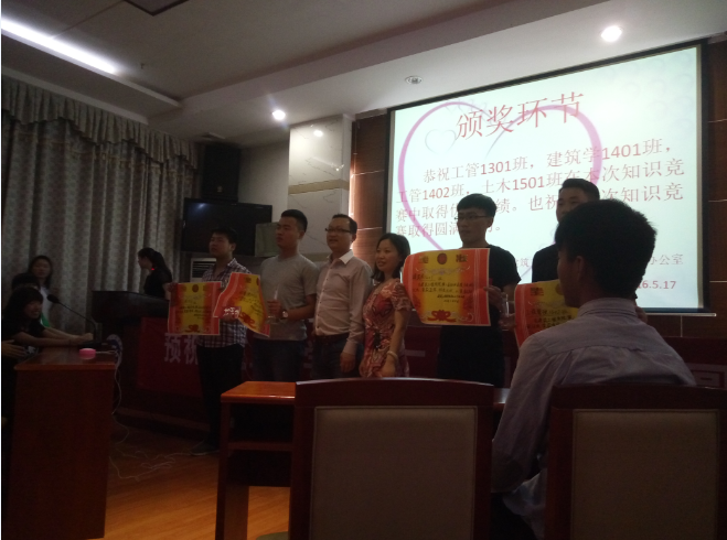 2016年5月17日晚7:30,beats365官方网站于新校区中层干部会议室进行第二届知识竞赛总决赛,进入决赛的班级分别为工程管理1301班和建筑学1401班,莅临本次活动的领导有公司党总支书记谢治民书记,员工工作办公室主任李佳老师,团总支书记唐喜梅老师,到场的有beats365官方网站团总支员工会全体干部干事以及比赛双方班级成员。