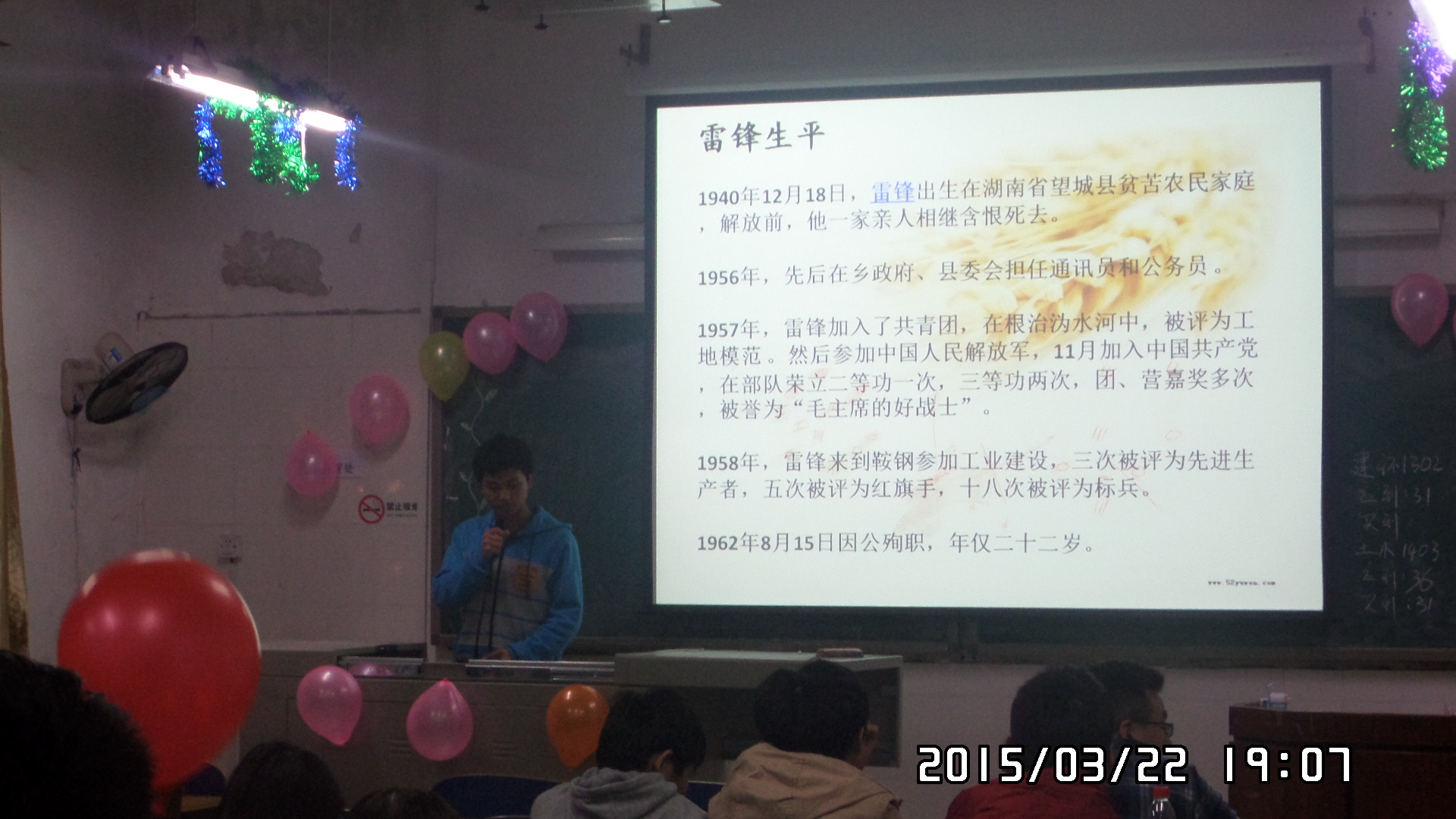 三月是学雷锋月,本次团日活动的主旨是弘扬雷锋精神,并将雷锋同志乐于助人,无私奉献的精神转为实际行动,从自身做起。活动主要以播放雷锋同志的纪录片为主,通过视频更真切的感受雷锋同志良好的生活作风。同时活动也以娱乐节目为辅,勾出各参与人员的兴趣,让活动体现出生动的一面。在活动进行中,学子们都表现出积极热情的一面,也会主动上台演讲,谈起自己对雷锋精神及行为的理解和领悟。大一大二学子间互相配合,使得活动有声有色的进行。