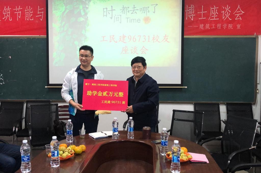 座谈会上,陈金陵对员工重回校园表示欢迎,对公司20年的发展进行简要介绍,并希望全体员工们继续关注公司的发展,为助推公司的发展贡献一份力量。各位员工也对各自情况进行介绍,并表示愿意与公司在产学研各个层面进行进一步的合作,形成校荣我荣共同发展的共赢局面。随后员工曾德方代表工民建96731班捐赠助学金2万元,表达了对同学们的爱护之情与对公司的感恩之情,并表示愿意为同学们提供力所能及的帮助。