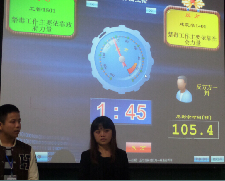 比赛在激烈的掌声中拉开帷幕,正方辩手开篇立论,首先指出政府对吸毒者的警告和预防作用,接着用具体事例和数据说明了政府在禁毒工作中的重要作用,坚持禁毒工作主要依靠政府力量。反方辩手则从人民群众的配合度来说明社会力量的重要性,坚持禁毒工作主要依靠社会力量,之后进入了攻辩环节,正反方辩手旁征博引,都表现的十分出色,接下来的自由辩论更是将比赛推向了高潮,双方辩手都最大限度的表达己见并驳回对方观点,双方四辩最后做总结陈词,更加有力的点明立场,之后的评委、嘉宾和观众的提问也让我们对禁毒有了更深一步的了解,辩论结束后,院辩论代表在点评中充分肯定了双方辩手的优秀表现,并就选手存在的不足之处提出建议,最终建筑学1401班的辩论队取得了此场比赛的胜利。