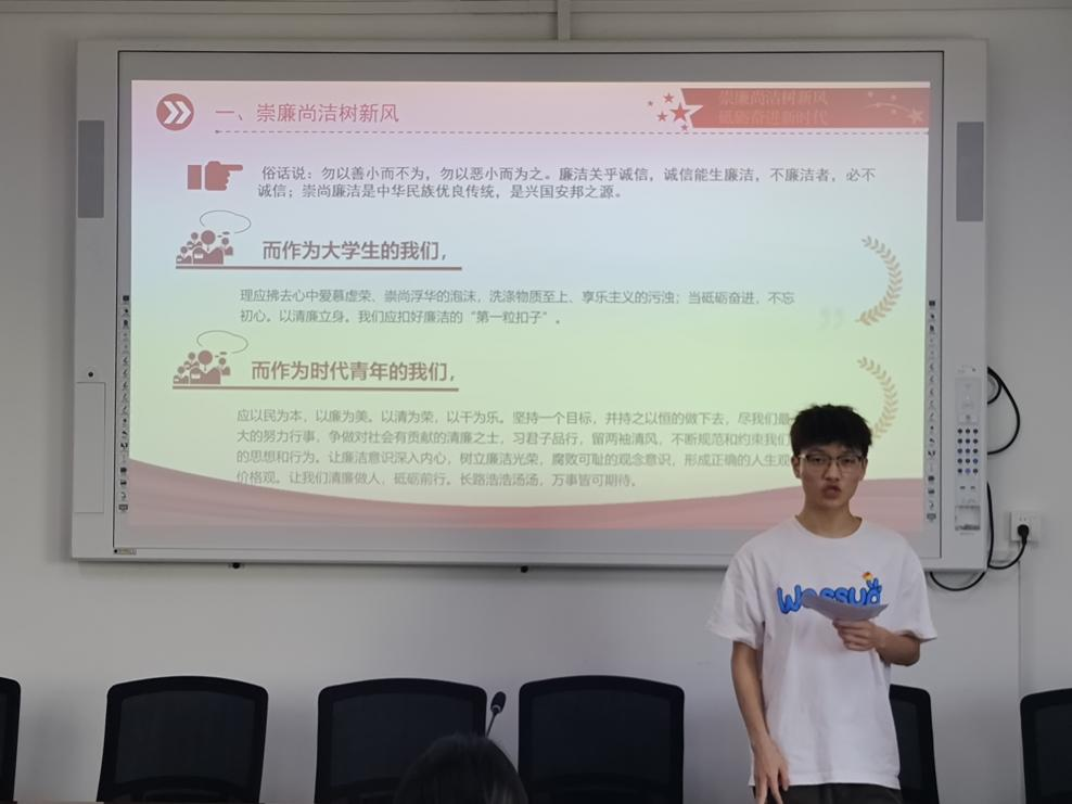 “以廉洁立身,以廉洁立业,以廉洁立世。”,在土木工程专业2202班汤鑫的一句句宣讲词中,大家一同走进了“清廉”的课堂,同时以“廉洁理念”设置趣味问答问答环节,引发青年员工对清廉意义与担当的思考,不求回报的贡献自身价值,争做新时代清廉青年。